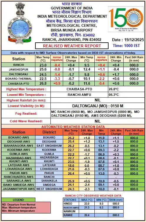 कोहरे का असर दृश्यता पर साफ नजर आया। डाल्टनगंज में विजिबिलिटी घटकर 150 मीटर तक पहुंच गई, जबकि देवघर में यह लगभग 200 मीटर रिकॉर्ड की गई। खराब दृश्यता और तकनीकी कारणों के चलते रांची एयरपोर्ट पर भी उड़ानों का संचालन प्रभावित हुआ। 18 नवंबर को इंडिगो की 20 उड़ानें और एयर इंडिया की 9 उड़ानें विलंब से पहुंचीं, जबकि तीन विमानों को रद्द करना पड़ा।