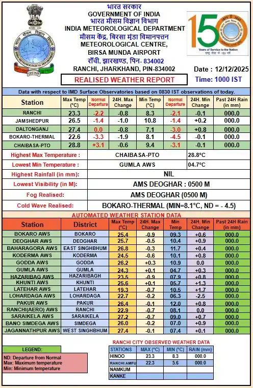 राज्य में चाईबासा का अधिकतम तापमान 28.8 डिग्री सेल्सियस दर्ज हुआ, जो झारखंड में इस समय सबसे अधिक है। इसके विपरीत गुमला के ऑटोमेटेड वेदर स्टेशन में न्यूनतम तापमान 4.7 डिग्री दर्ज किया गया, जो मौजूदा समय में राज्य का सबसे कम तापमान है।