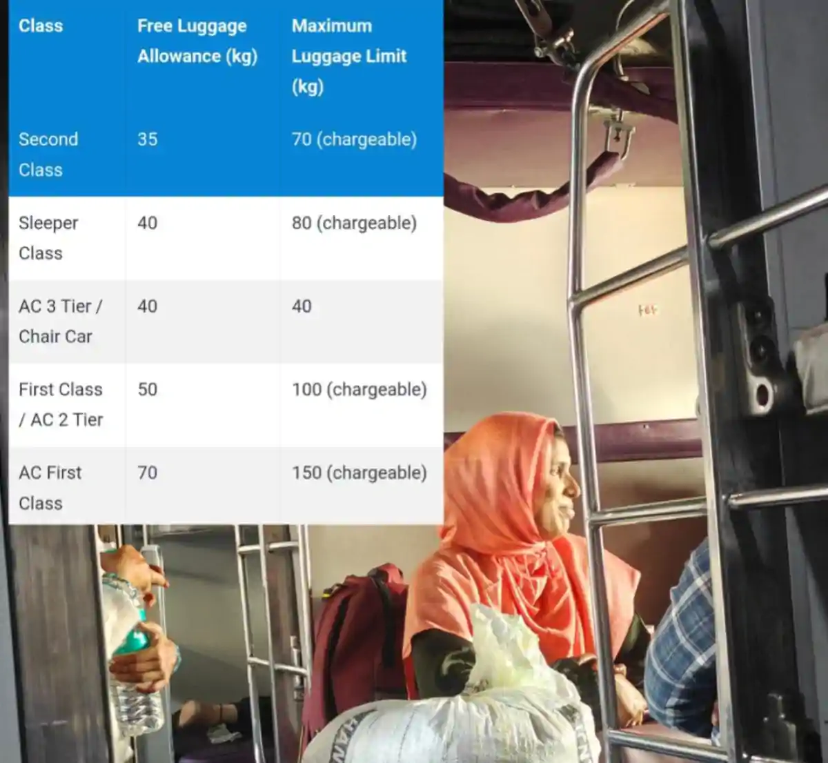 स्लीपर क्लास: 40 किलो (अधिकतम 80 किलो, अतिरिक्त शुल्क के साथ)