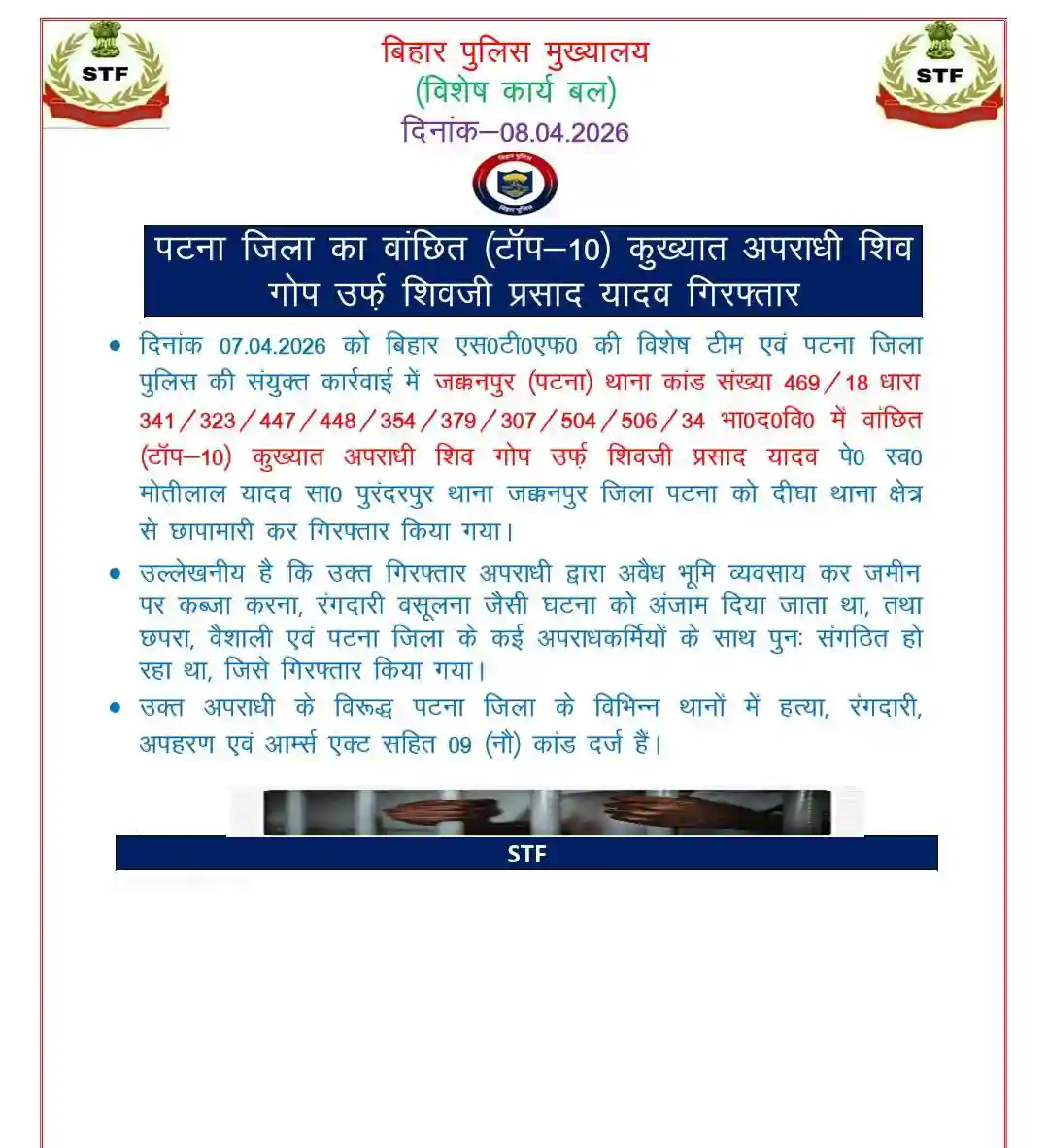 पटना में STF की बड़ी कार्रवाई, दीघा से पकड़ा गया खतरनाक अपराधी शिव गोप