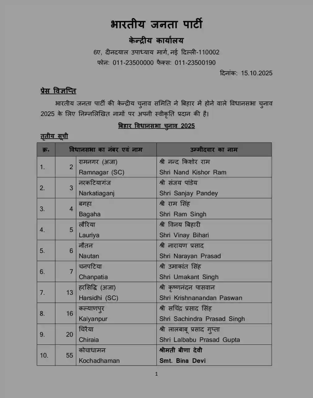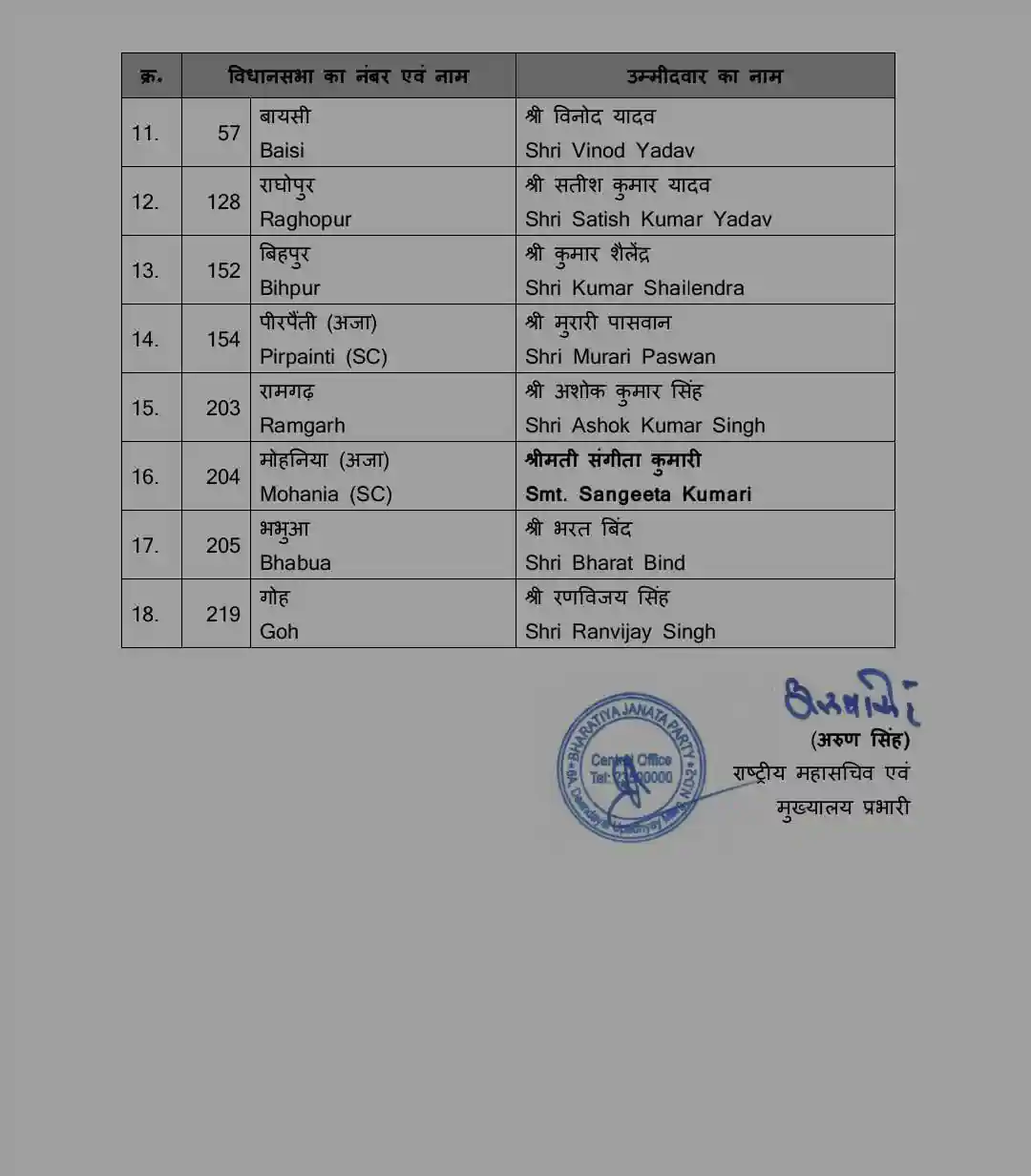बीजेपी ने बुधवार रात करीब 11 बजे कैंडिडेट्स की तीसरी लिस्ट जारी कर दी। इसमें दो महिलाओं समेत 18 कैंडिडेट हैं। कोचाधामन से वीणा देवी और मोहनिया से संगीता कुमारी को टिकट दिया गया है। संगीता कुमारी दो दिन पहले आरजेडी से बीजेपी में शामिल हुई थीं।