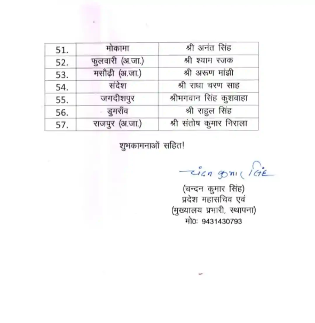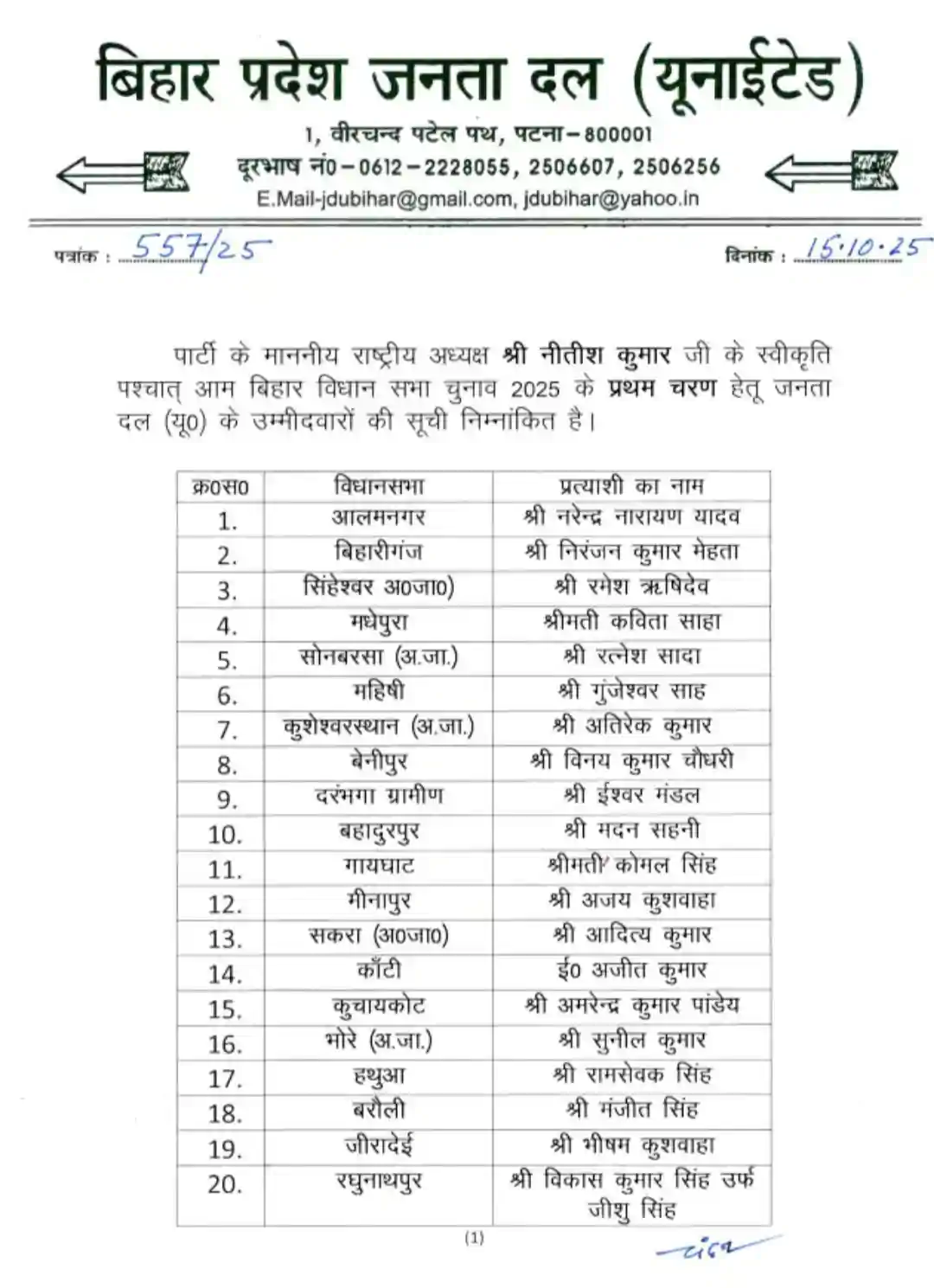 जेडीयू द्वारा जारी सूची में विभिन्न विधानसभा क्षेत्रों के लिए कई उम्मीदवारों के नाम शामिल किए गए हैं। आलमनगर से नरेंद्र नारायण यादव को उम्मीदवार बनाया गया है। बिहारीगंज से नरेंद्र कुमार मेहता, सिंघेश्वर से रमेश ऋषि देव और मधेपुरा से कविता साहा को टिकट मिला है। सोनबरसा से रत्नेश सादा,महिषी से गुंजेश्वर शाह और कुशेश्वरस्थान से अतिरेक कुमार को उम्मीदवार घोषित किया गया है। बेनीपुर से विनय कुमार चौधरी, दरभंगा ग्रामीण से ईश्वर मंडल और बहादुरपुर से मदन सहनी को भी टिकट दिया गया है।