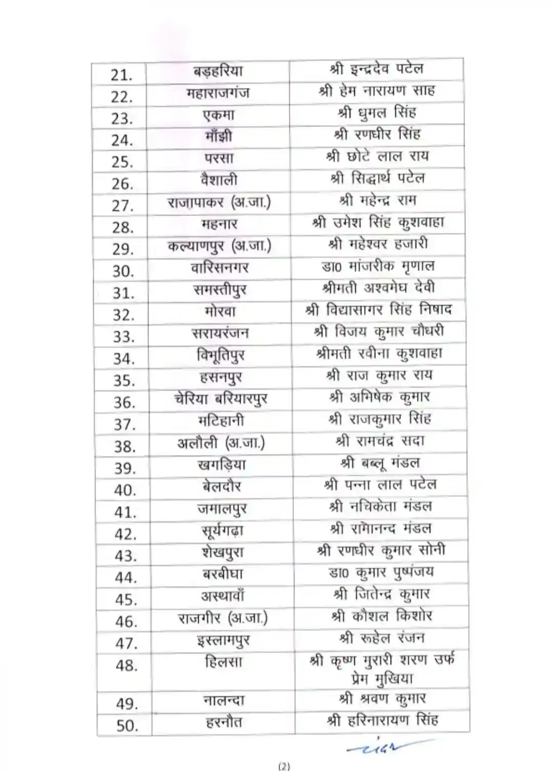 सरायरंजन से विजय कुमार चौधरी के बेटे के चुनाव लड़ने की सूचना थी, लेकिन पार्टी ने फिर से मंत्री विजय चौधरी को ही उतारा है। 2020 में सबसे कम 12 वोटों से चुनाव जीते कृष्ण मुरारी शरण ऊर्फ प्रेम मुखिया को फिर से हिलसा से टिकट दिया गया है।
