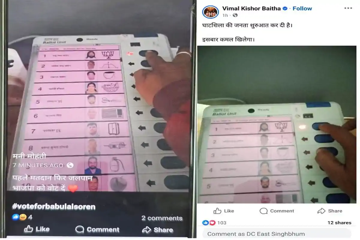 जानकारी के मुताबिक, भाजपा नेता विमल किशोर बैठा और भाजपा के मनी मोहंती ने अपने-अपने फेसबुक अकाउंट पर भाजपा प्रत्याशी बाबूलाल सोरेन के पक्ष में EVM मशीन दबाते हुए फोटो पोस्ट किया। विमल किशोर बैठा ने फोटो के कैप्शन में लिखा कि “घाटशिला की जनता शुरुआत कर दी है। इस बार कमल खिलेगा।” वहीं, मनी मोहंती ने पोस्ट में “पहले मतदान फिर जलपान” का स्लोगन लिखकर भाजपा को वोट देने की अपील की।