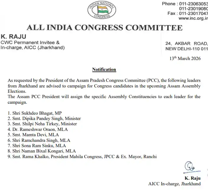 यह सूचना झारखंड कांग्रेस के प्रभारी के. राजू की ओर से जारी की गई है. अधिसूचना के अनुसार, झारखंड से चुने गए नेता असम में पार्टी के उम्मीदवारों के पक्ष में जनसभाएं, बैठकें और अन्य चुनावी कार्यक्रमों में हिस्सा लेकर प्रचार करेंगे.
