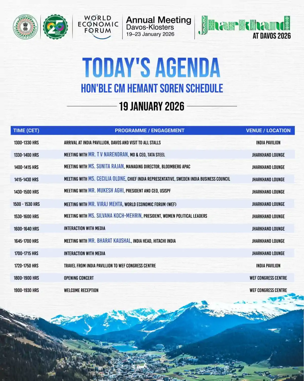 इसके अलावा ब्लूमबर्ग APAC, स्वीडन इंडिया बिजनेस काउंसिल और यूएस-इंडिया स्ट्रेटेजिक पार्टनरशिप फोरम (USISPF) के प्रतिनिधियों के साथ संवाद के जरिए निवेश सुगमता, वैश्विक बाजारों से एकीकरण और सहयोग के नए रास्तों पर मंथन किया जाएगा। प्रतिनिधिमंडल विश्व आर्थिक मंच के वरिष्ठ अधिकारियों से भी मुलाकात कर वैश्विक आर्थिक और नीतिगत विमर्श को आकार देने वाले मंचों में झारखंड की सक्रिय भागीदारी की प्रतिबद्धता को दोहराएगा।