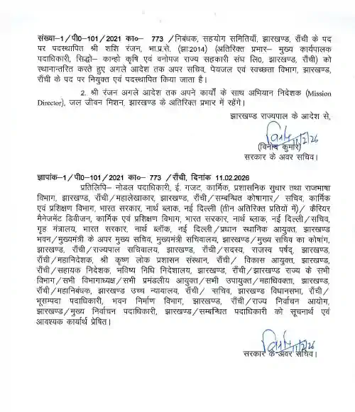 सरकार ने ग्रामीण विकास सचिव श्रीनिवासन को ऊर्जा विभाग का सचिव नियुक्त करते हुए उन्हें झारखंड ऊर्जा विकास निगम और बिजली वितरण निगम के सीएमडी पद का अतिरिक्त प्रभार भी दिया है।