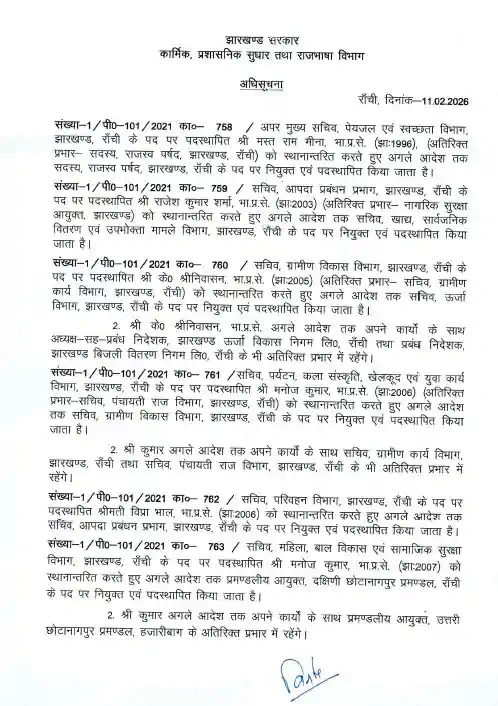 इसके अलावा पर्यटन, कला संस्कृति एवं खेलकूद विभाग के सचिव मनोज कुमार को ग्रामीण विकास एवं ग्रामीण कार्य विभाग की कमान सौंपी गई है।
