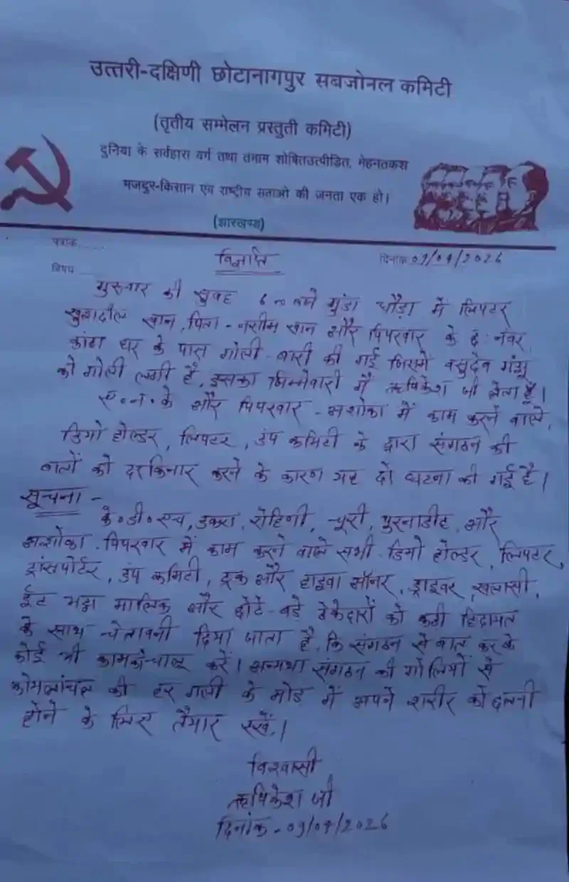 इसके अलावा, पर्चे में पिपरवार, अशोका, केडीएच, डकरा, रोहिणी, चूरी और पुरनाडीह जैसे क्षेत्रों में काम कर रहे सभी लोगों को आगाह किया गया है कि वे किसी भी गतिविधि से पहले संगठन से संपर्क करें। ऐसा नहीं करने पर गंभीर परिणाम भुगतने की चेतावनी दी गई है।