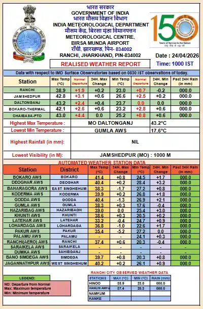 इस बदलाव से पहले राज्य में गर्मी का प्रकोप चरम पर रहा। पिछले 24 घंटों के दौरान कई जिलों में तापमान 40 डिग्री सेल्सियस से ऊपर दर्ज किया गया। डाल्टनगंज सबसे गर्म स्थान रहा, जहां पारा 43.2 डिग्री तक पहुंच गया। इसके अलावा चाईबासा में 43 डिग्री, जमशेदपुर में 42.8 डिग्री और बोकारो में 42.1 डिग्री तापमान रिकॉर्ड हुआ। रांची में अधिकतम तापमान 38.9 डिग्री रहा, जो सामान्य से लगभग दो डिग्री अधिक है।