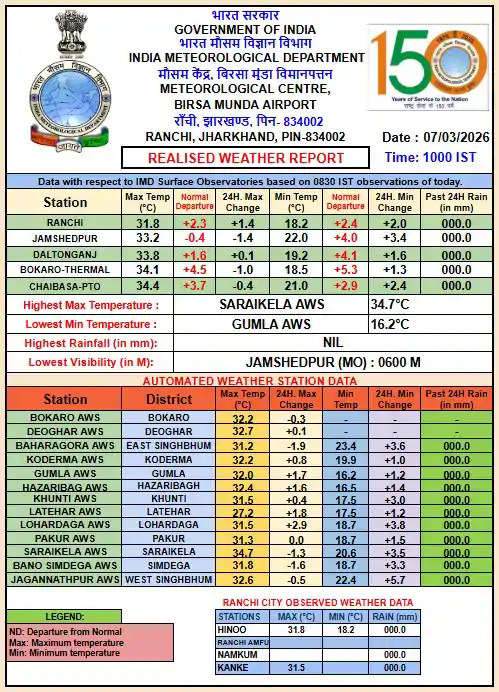 10 मार्च को भी उत्तर-पूर्वी जिलों में आंशिक बादल छाए रहने के साथ कुछ जगहों पर हल्की बारिश हो सकती है। राजधानी रांची और उसके आसपास के क्षेत्रों में 7 से 9 मार्च के बीच आसमान में बादल छाए रहने और गरज वाले बादल बनने की संभावना जताई गई है। इस दौरान अधिकतम तापमान 31 से 34 डिग्री सेल्सियस के बीच रहने का अनुमान है, जबकि न्यूनतम तापमान 17 से 18 डिग्री सेल्सियस के आसपास रह सकता है।