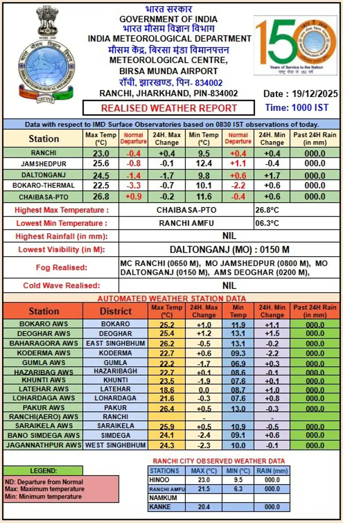 मौसम केंद्र की 19 दिसंबर की सुबह जारी रिपोर्ट के अनुसार लातेहार में अधिकतम तापमान 18.6 डिग्री सेल्सियस तक गिर गया, जिससे दिन में भी ठंड महसूस हो रही है। इसके अलावा राज्य के 10 अन्य जिलों में अधिकतम तापमान 25 डिग्री से नीचे, कहीं 22.2 डिग्री तक दर्ज किया गया है। इन जिलों में रांची, डाल्टनगंज, बोकारो, कोडरमा, गुमला, हजारीबाग, खूंटी, लोहरदगा, सिमडेगा और पश्चिमी सिंहभूम शामिल हैं।