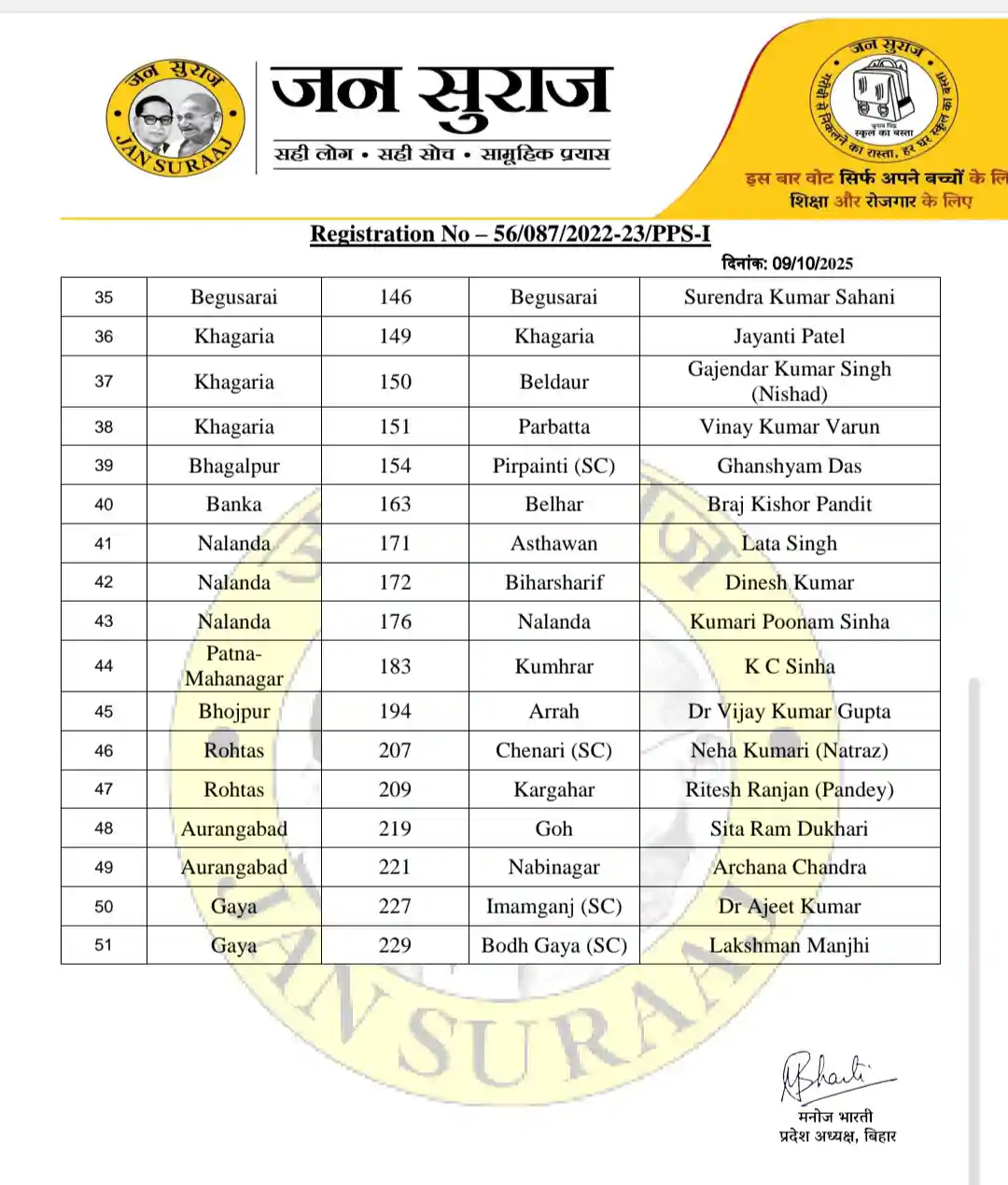 प्रशांत किशोर की पार्टी जनसुराज ने गुरुवार को 51 कैंडिडेट्स की लिस्ट जारी की। जनसुराज के राष्ट्रीय अध्यक्ष उदय सिंह ने कैंडिडेट्स का ऐलान किया। प्रेस कॉन्फ्रेंस में प्रशांत किशोर मौजूद नहीं थे। सहरसा से किशोर कुमार मुन्ना होंगे उम्मीदवार। वाल्मीकिनगर से दीर्घ नारायण प्रसाद, पूर्णिया के अमौर अफरोज आलम, कटिहार के प्राणपुर से कुणाल निषाद, सुपौल से निर्मली रामप्रवेश कुमार यादव, सुरसंड से ऊषा किरण, लोरिया से सुनील कुमार को टिकट दिया गया है।
