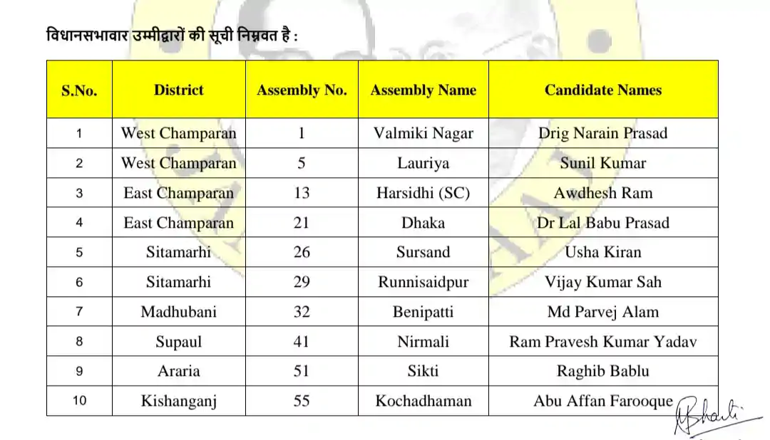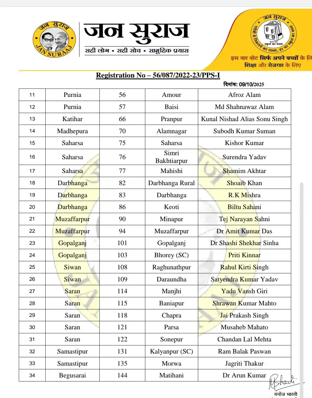 दरभंगा से आरके मिश्रा, गोपालगंज से प्रीति किन्नर, कुम्हरार से केसी सिन्हा, मांझी से वाई बी गिरी को टिकट दिया गया है। करगहर से भोजपुरी सिंगर रितेश पांडेय को प्रशांत किशोर ने चुनावी मैदान में उतारा है।