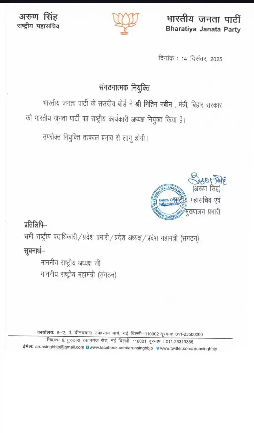 बीजेपी के राष्ट्रीय महासचिव एवं मुख्यालय प्रभारी अरुण सिंह द्वारा जारी आदेश के अनुसार, यह नियुक्ति भारतीय जनता पार्टी के संसदीय बोर्ड द्वारा की गई है. आदेश में स्पष्ट किया गया है कि नितिन नबीन, जो वर्तमान में बिहार सरकार में मंत्री हैं, अब राष्ट्रीय स्तर पर संगठन की महत्वपूर्ण जिम्मेदारी संभालेंगे.