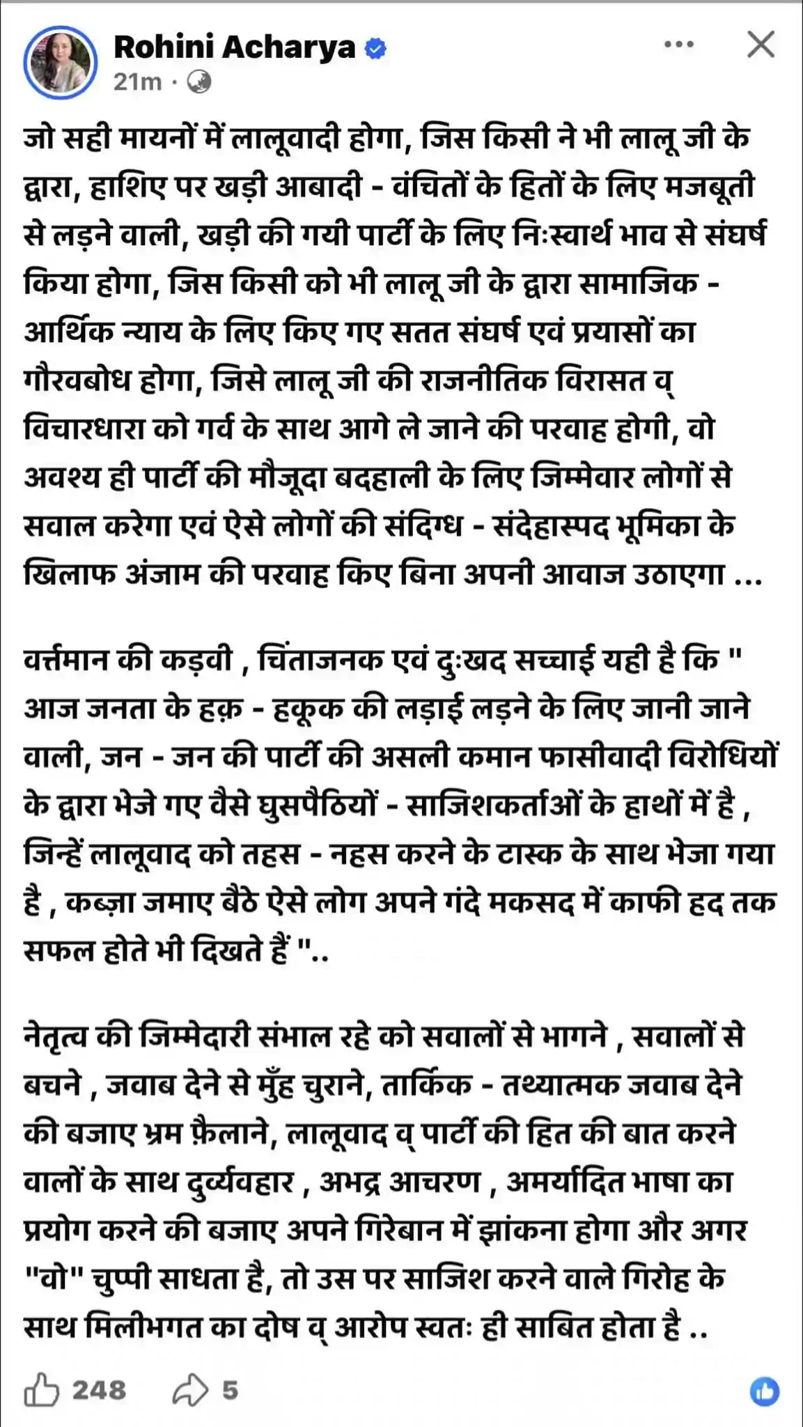 रोहिणी ने लालू के सामाजिक-आर्थिक न्याय की लड़ाई और राजनीतिक विरासत को आगे ले जाने की बात पर जोर देते हुए कहा, 'जिस किसी को भी लालू के द्वारा सामाजिक-आर्थिक न्याय के लिए किए गए सतत संघर्ष एवं प्रयासों का गौरवबोध होगा, जिसे लालू जी की राजनीतिक विरासत व  विचारधारा को गर्व के साथ आगे ले जाने की परवाह होगी, वो अवश्य ही पार्टी की मौजूदा बदहाली के लिए जिम्मेदार लोगों से सवाल करेगा एवं ऐसे लोगों की संदिग्ध-संदेहास्पद भूमिका के खिलाफ अंजाम की परवाह किए बिना अपनी आवाज उठाएगा...